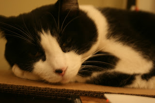 Wilson watched over the fuss by laying on Scott's desk on a smaller piece of cardboard.